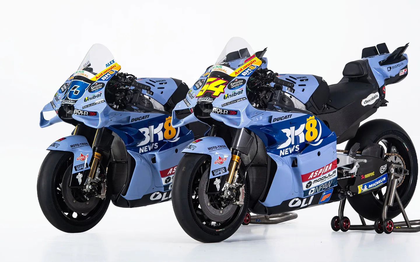 Новата боја, откриена на сцената, претставува еволуција на идентитетот на Gresini Racing: суштински и модерен дизајн, чисти површини и нагласени волумени, со иконичната светлосина боја на тимот интерпретирана во побогат и покомпактен финиш. Јасна стилска одлука која ги напушта хромираните детали со цел да се изрази уште посилен тркачки карактер.