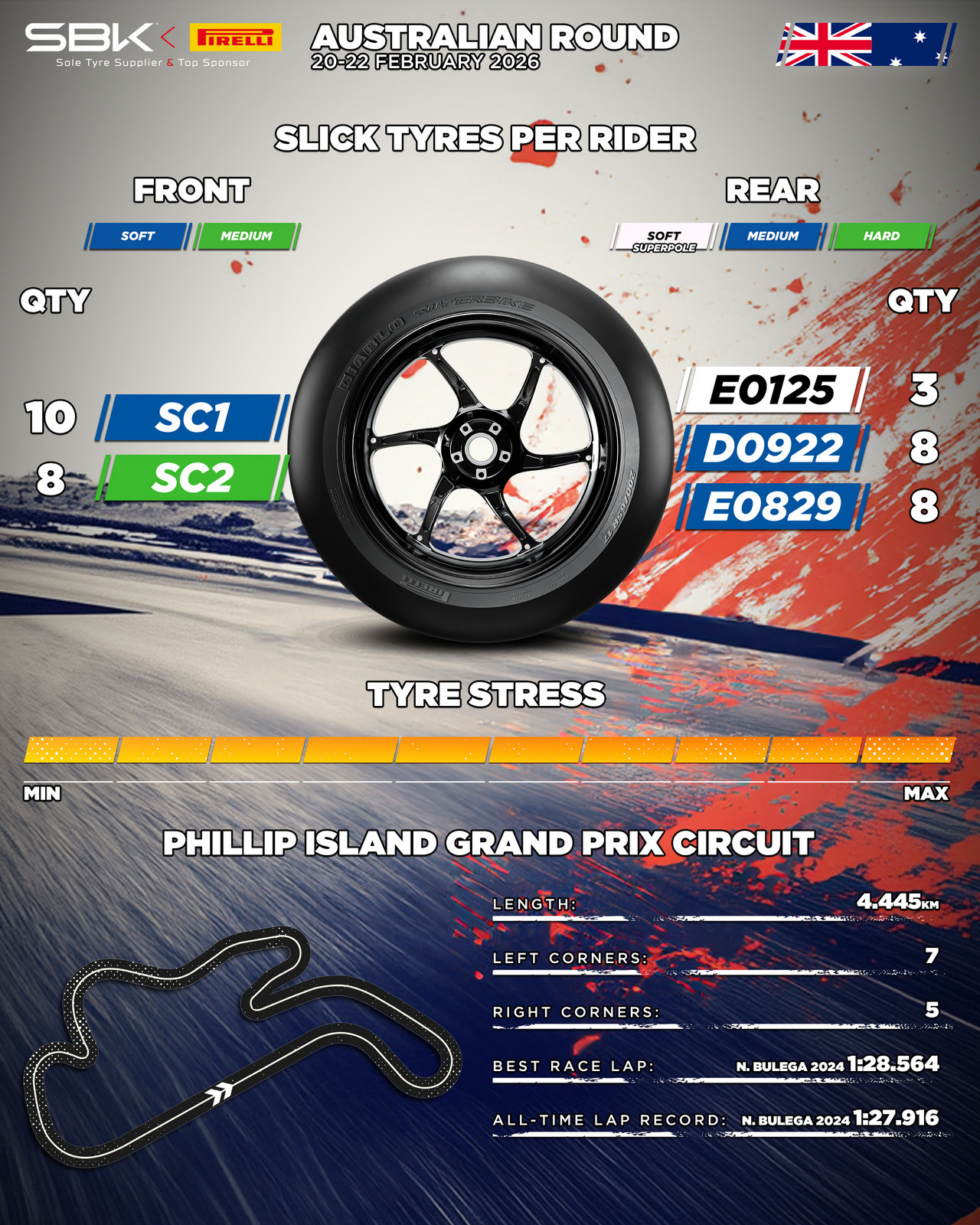За тркачкиот викенд на Филип Ајленд, возачите во WorldSBK ќе имаат на располагање две предни и три задни слика: мека SC1 и средна SC2 напред. За задниот дел, на развојното решение со средна смеса D0922 кое веќе беше присутно на тестирањата, ќе бидат додадени уште две опции: новата средна E0829 и меката спецификација E0125. D0922 ќе биде достапна и како единствена задна опција за класата WorldSSP, која за првпат ги користи истите димензии на гуми како и колегите од WorldSBK.